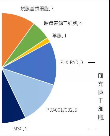從細(xì)胞來源來看,66%(23項(xiàng))為間充質(zhì)干細(xì)胞;20%(7項(xiàng))為蛻膜基質(zhì)細(xì)胞;11%(4項(xiàng))登記為胎盤來源干細(xì)胞,其中2項(xiàng)是聯(lián)合臍帶血造血干細(xì)胞應(yīng)用。