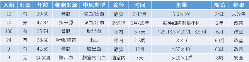 從安全性來(lái)看,幾乎所有的臨床研究均無(wú)副作用的報(bào)道。臨床研究無(wú)法像動(dòng)物實(shí)驗(yàn)一樣將治療時(shí)間窗控制在 1-7 天內(nèi),這 6 項(xiàng)研究的治療時(shí)間分布在發(fā)病后的 5 天到 20 年之間。