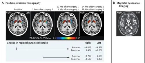 2020年,《新英格蘭醫(yī)學雜志》報道的案例移植了患者自體誘導多能干細胞(iPSC)衍生的多巴胺能前體細胞。移植部位為左半球和右半球的殼核,總共2次移植,時間間隔為6個月,每次移植劑量為400萬個細胞。影像學檢查表明,兩個iPSC來源的移植物已經遞送至靶標的殼核位置,并穩(wěn)定的存活在患者體內。