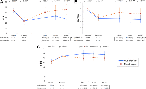 隨訪60個月時,治療組VAS疼痛評分明顯優(yōu)于微骨折手術(shù)對照組;隨訪36個月和60個月時,治療組的WOMAC和IKDC評分明顯優(yōu)于對照組。