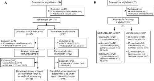 本次研究總共有114名患者參與,他們被隨機(jī)分配到UCB-MSC-HA移植治療組(57名患者)和微骨折手術(shù)對照組(57名患者)。最終共有89名患者完成了3期臨床試驗(治療組43例,對照組46例),其中73人參加了5年的隨訪研究。