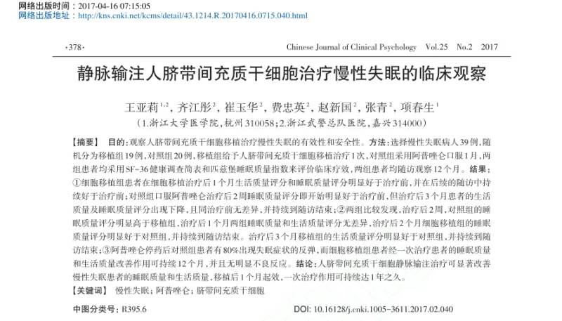 2017年,發(fā)表在《中國(guó)臨床心理學(xué)》雜志的一項(xiàng)臨床觀察成果顯示,靜脈輸注臍帶間充質(zhì)干細(xì)胞可長(zhǎng)期改善慢性失眠患者的睡眠質(zhì)量。